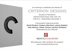 The Criterion Collection, a continuing series of important classic and contemporary films, has commissioned work from some of the most exciting illustrators and designers working today. Artists David Plunkert, Gregory Manchess, Leanne Shapton, Yuko Shimizu, Adrian Tomineand Ron Wimberly, along with moderator Eric Skillman, will discuss the process of creating new art for great cinema, and celebrate the release of Criterion Designs, a new book featuring features covers, supplemental art and never-before-seen sketches and concept art. Followed by a book signing and reception.