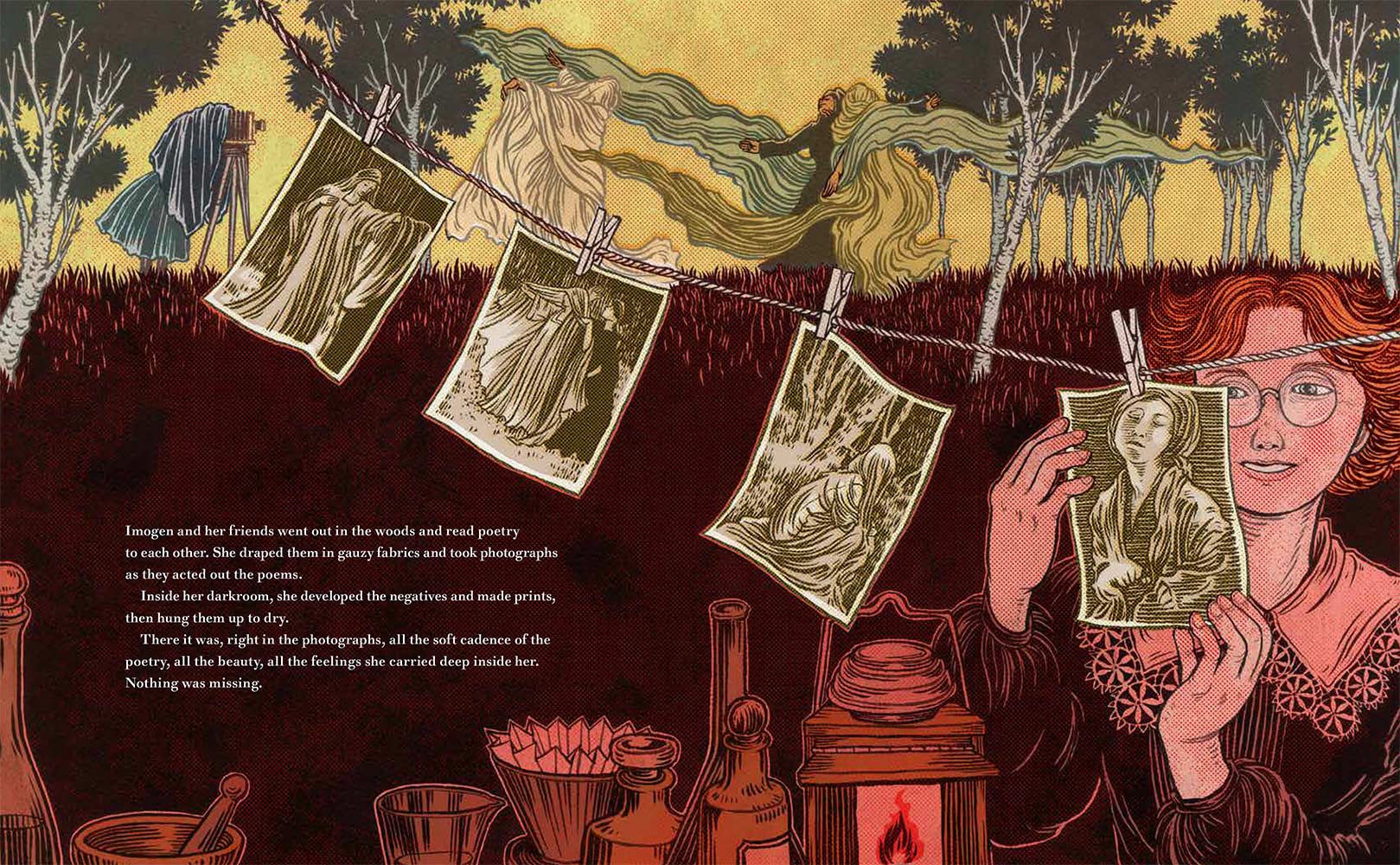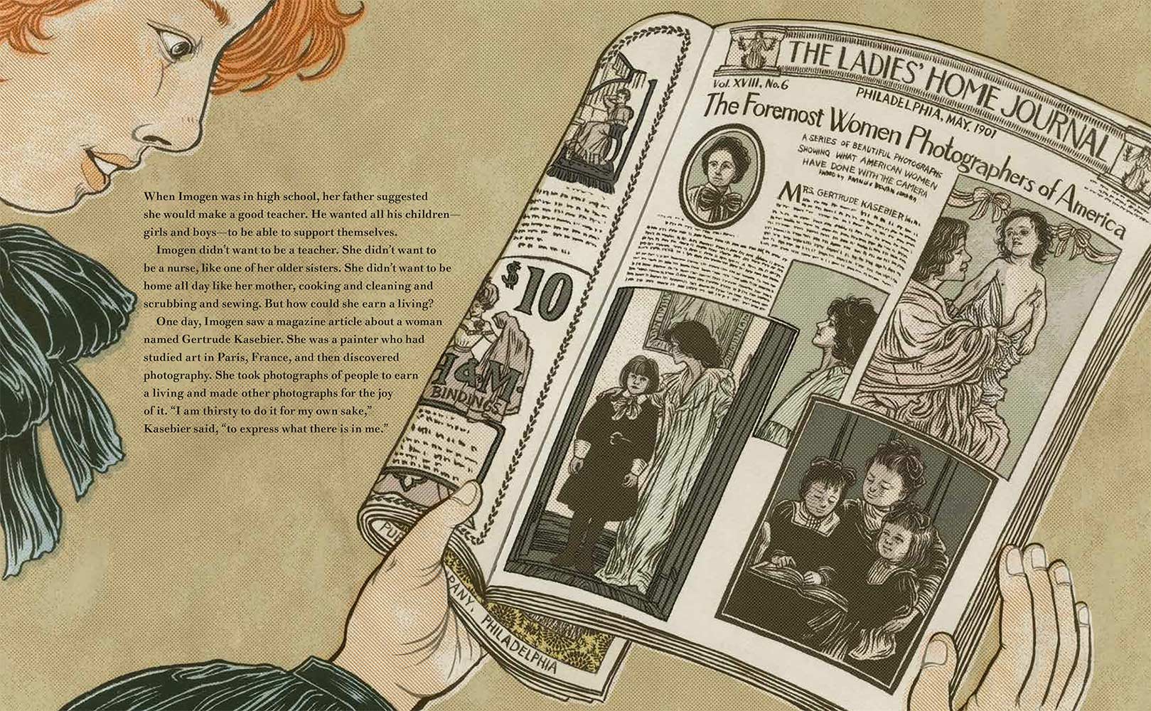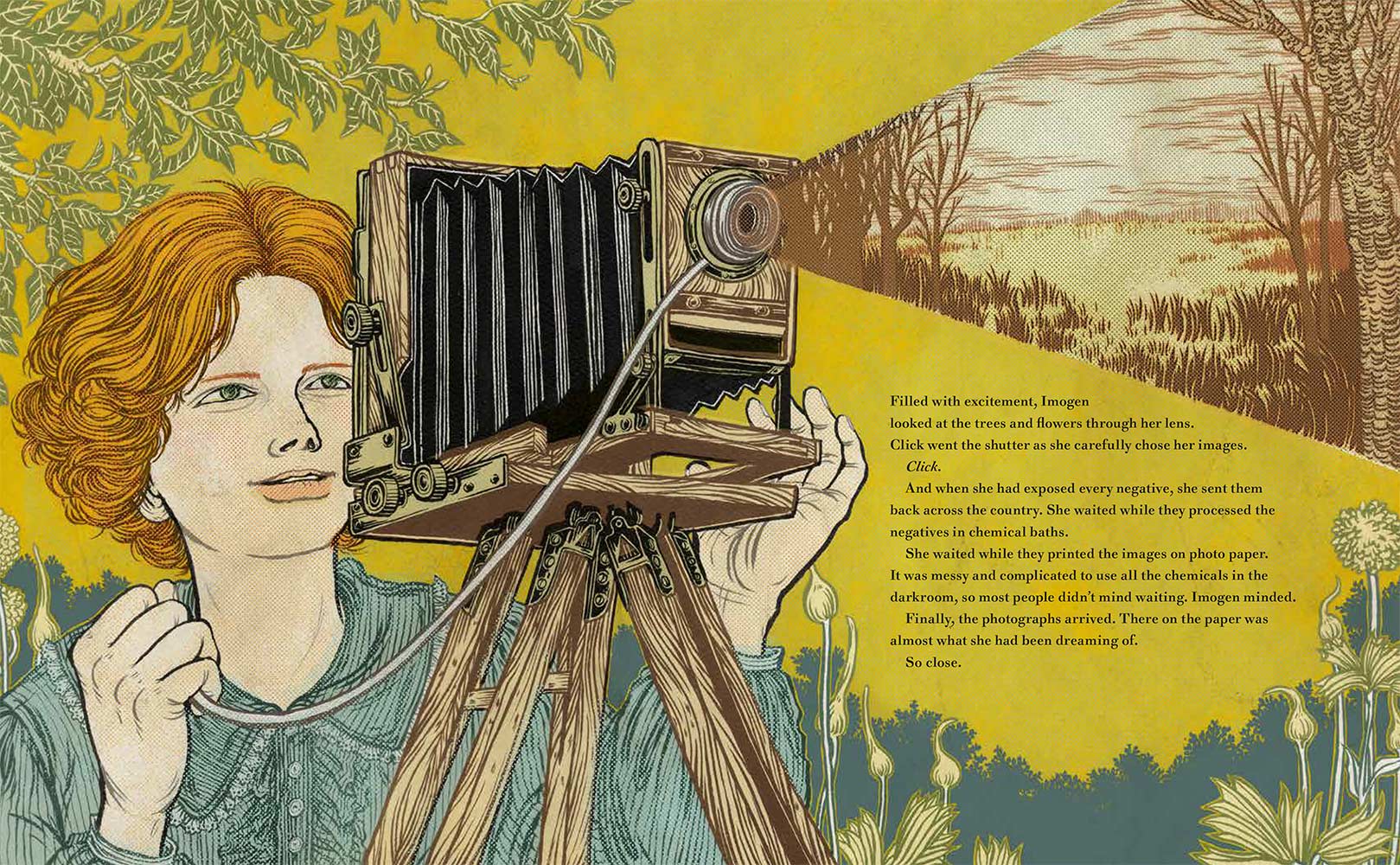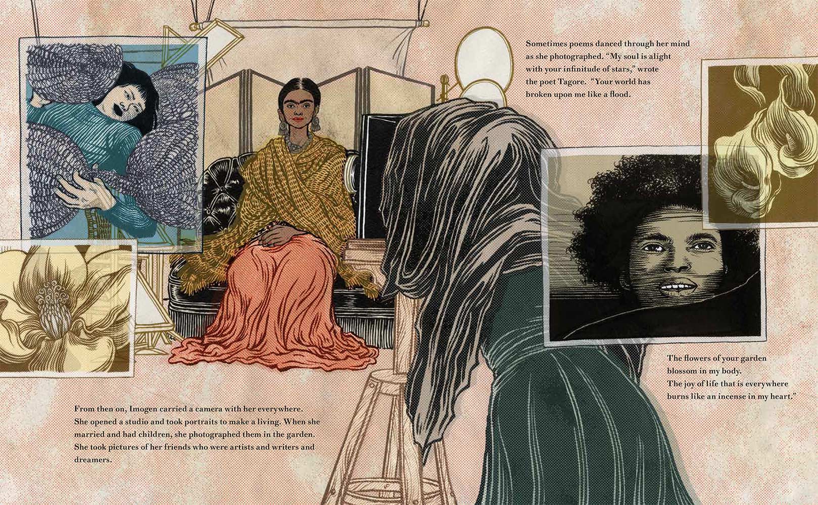 “Imogen Cunningham loved to observe the world. She noticed the colors in the woods outside her house and how light and shadows moved between the trees. She tried to capture this beauty on paper with pencils, but something was missing. One day she read about a woman in Paris who earned a living as a photographer, and she knew she was meant to do the same. With the support of her loving father, she then began her journey to become one of the most important photographers in America.