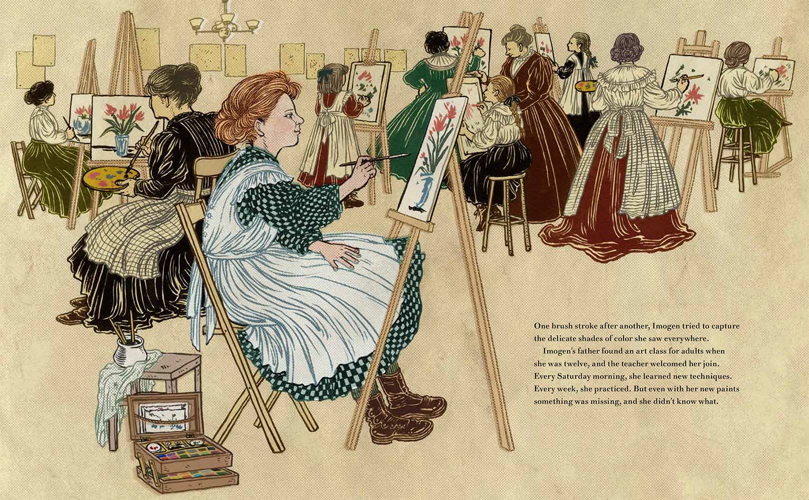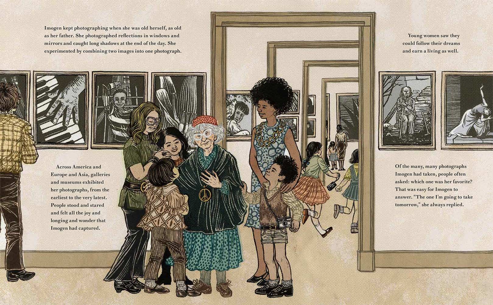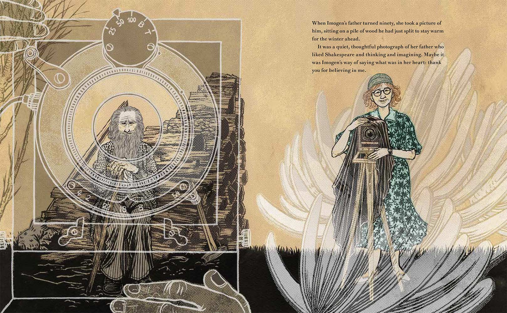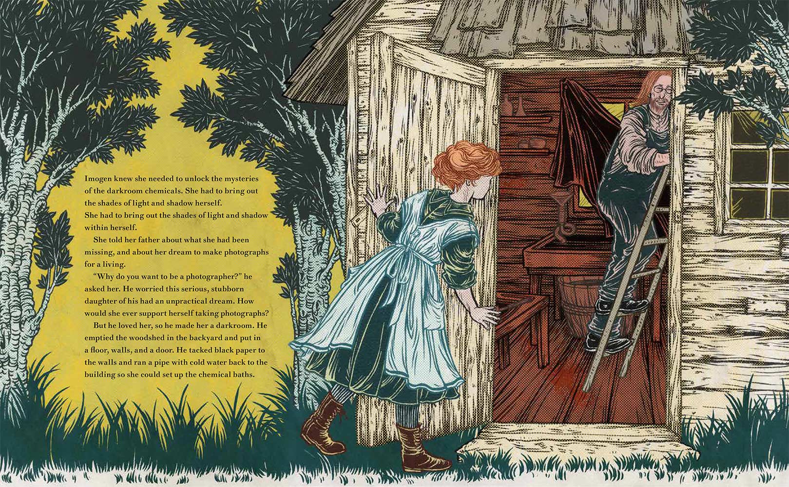 “Imogen Cunningham loved to observe the world. She noticed the colors in the woods outside her house and how light and shadows moved between the trees. She tried to capture this beauty on paper with pencils, but something was missing. One day she read about a woman in Paris who earned a living as a photographer, and she knew she was meant to do the same. With the support of her loving father, she then began her journey to become one of the most important photographers in America.
