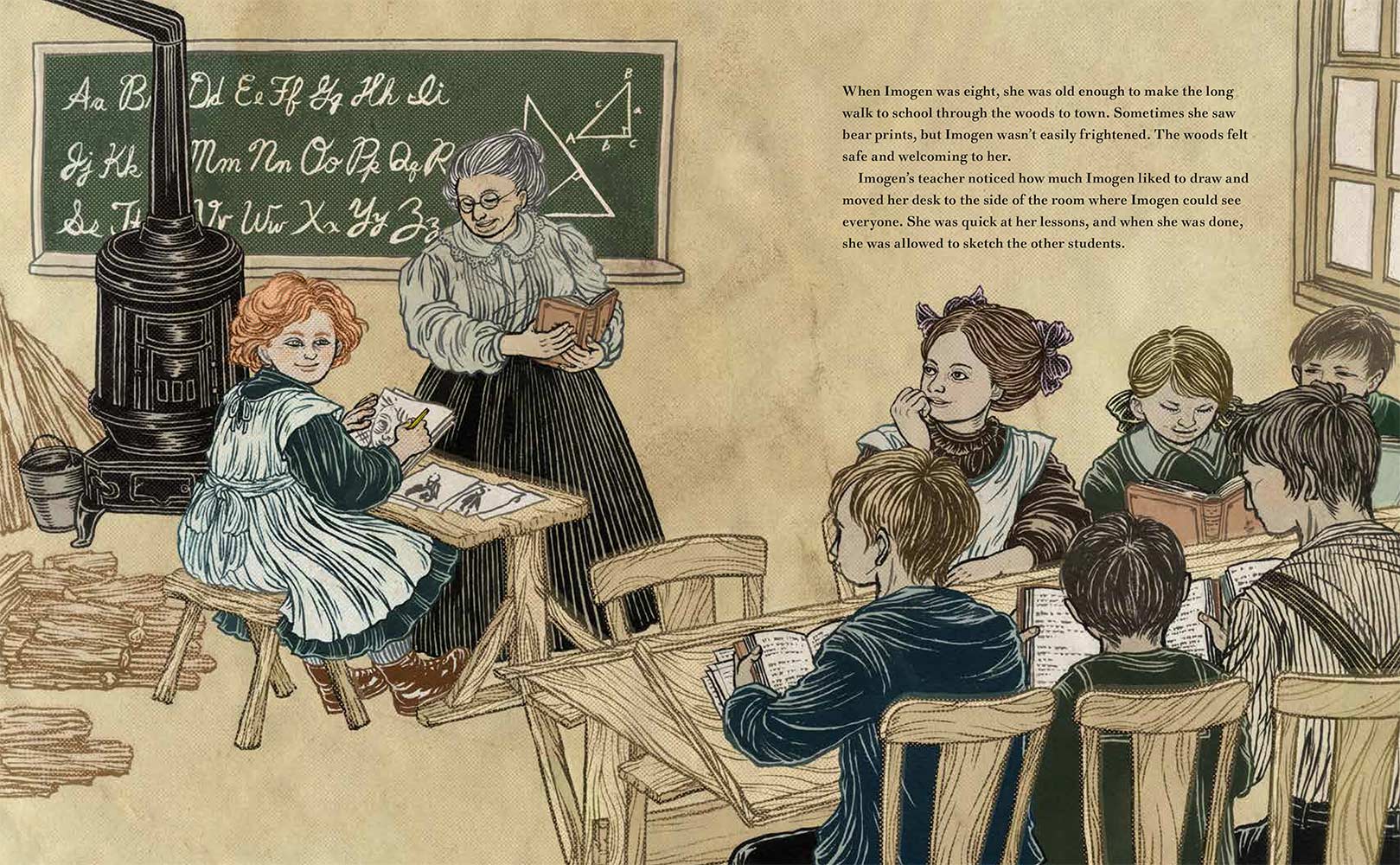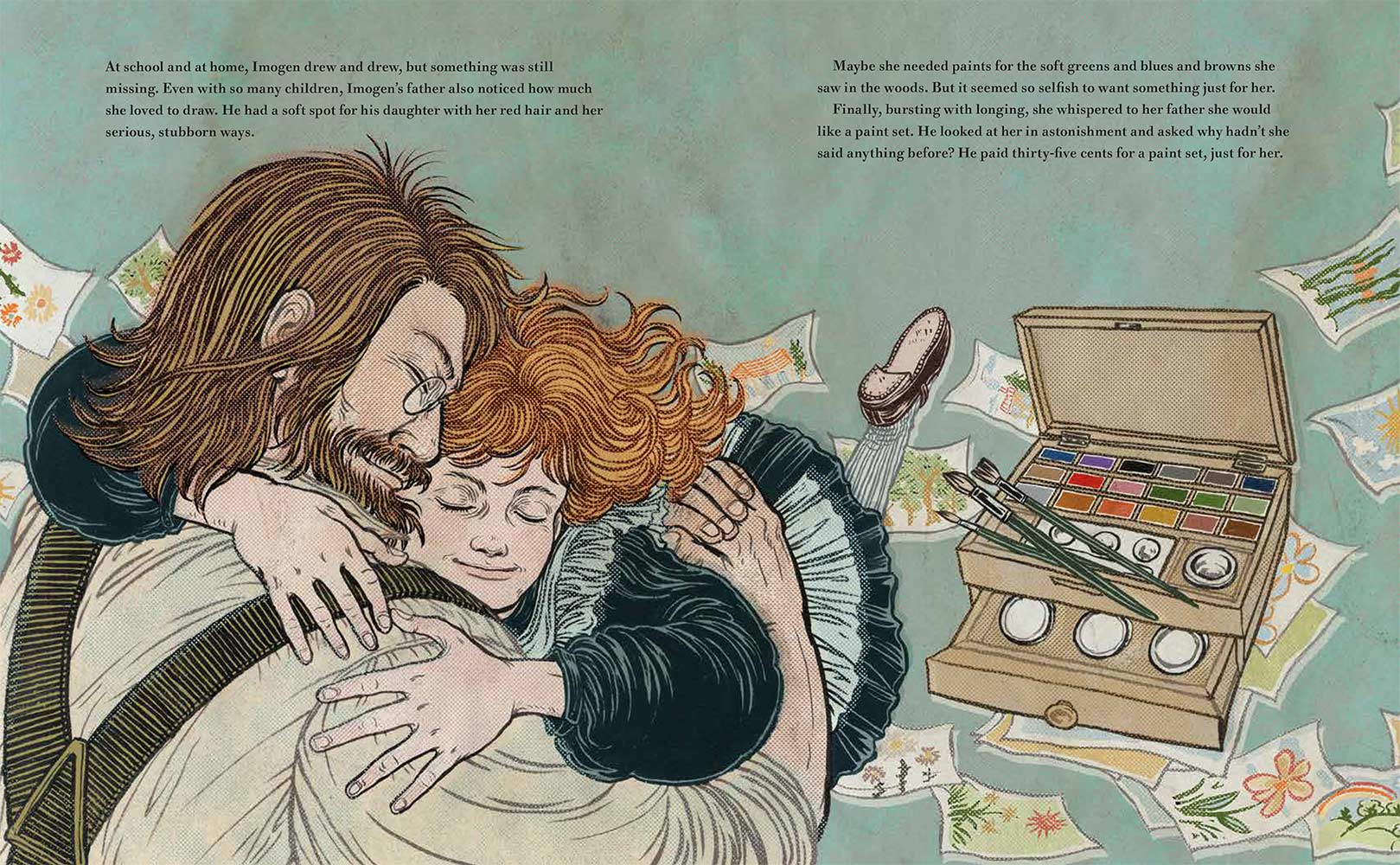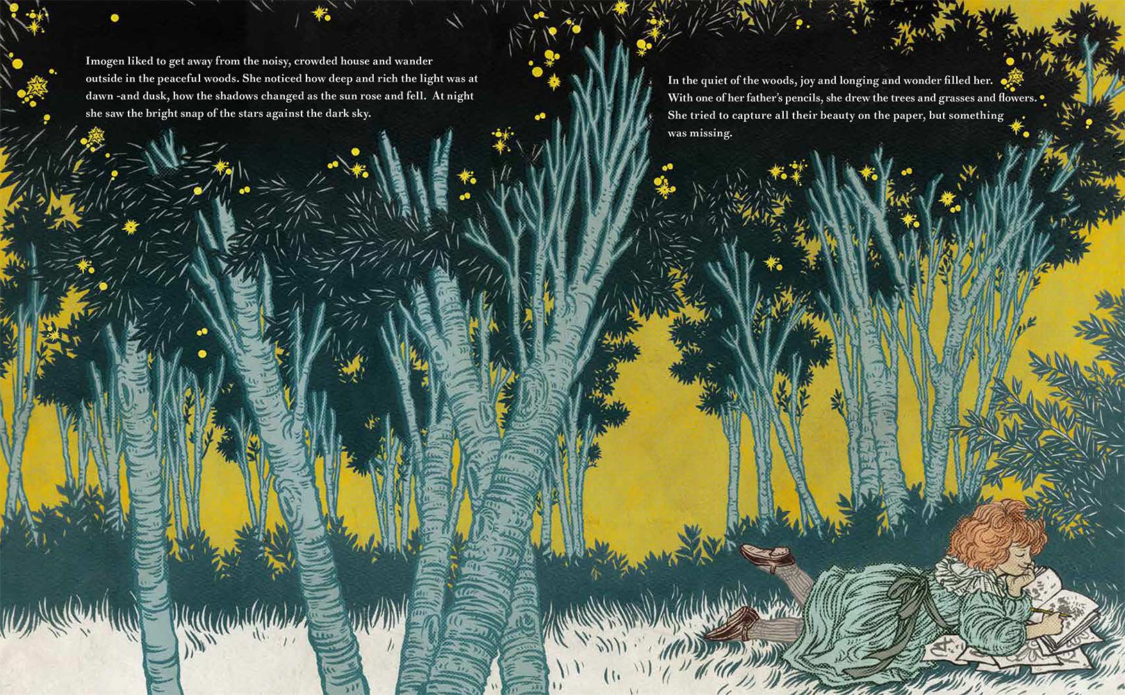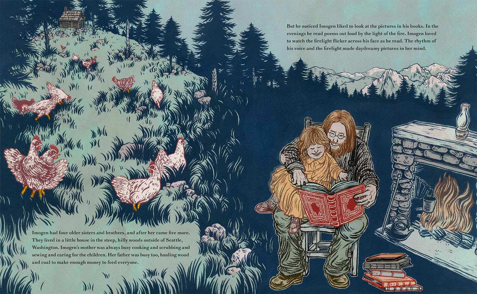 “Imogen Cunningham loved to observe the world. She noticed the colors in the woods outside her house and how light and shadows moved between the trees. She tried to capture this beauty on paper with pencils, but something was missing. One day she read about a woman in Paris who earned a living as a photographer, and she knew she was meant to do the same. With the support of her loving father, she then began her journey to become one of the most important photographers in America.